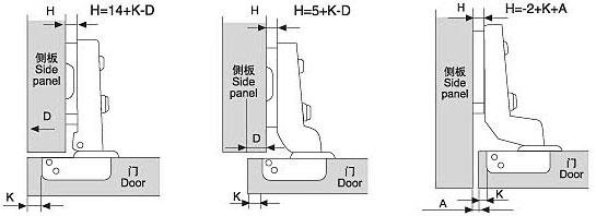利用以下公式?jīng)Q定鉸鏈臂的種類(lèi),解決問(wèn)題時(shí),必須有門(mén)身鉆孔"K”及安裝板高度“H”的數(shù)值。